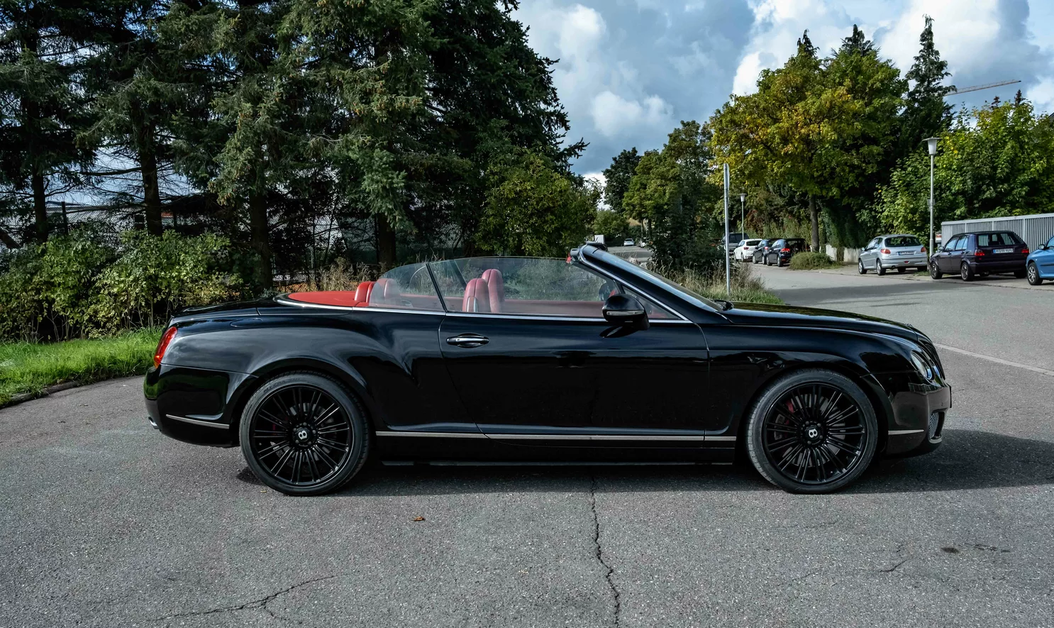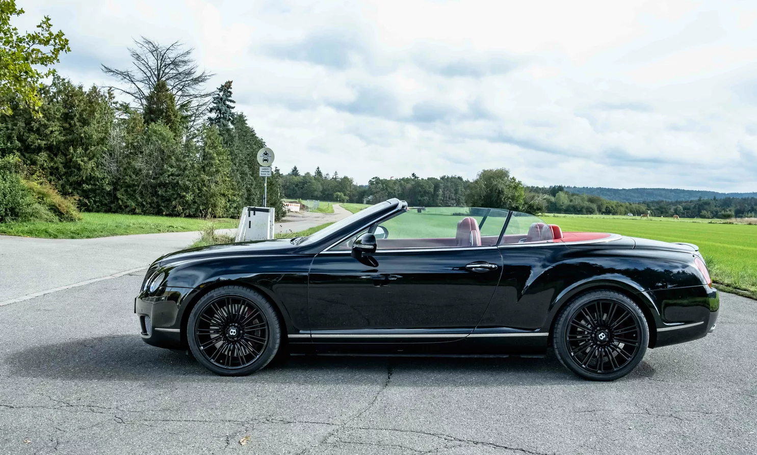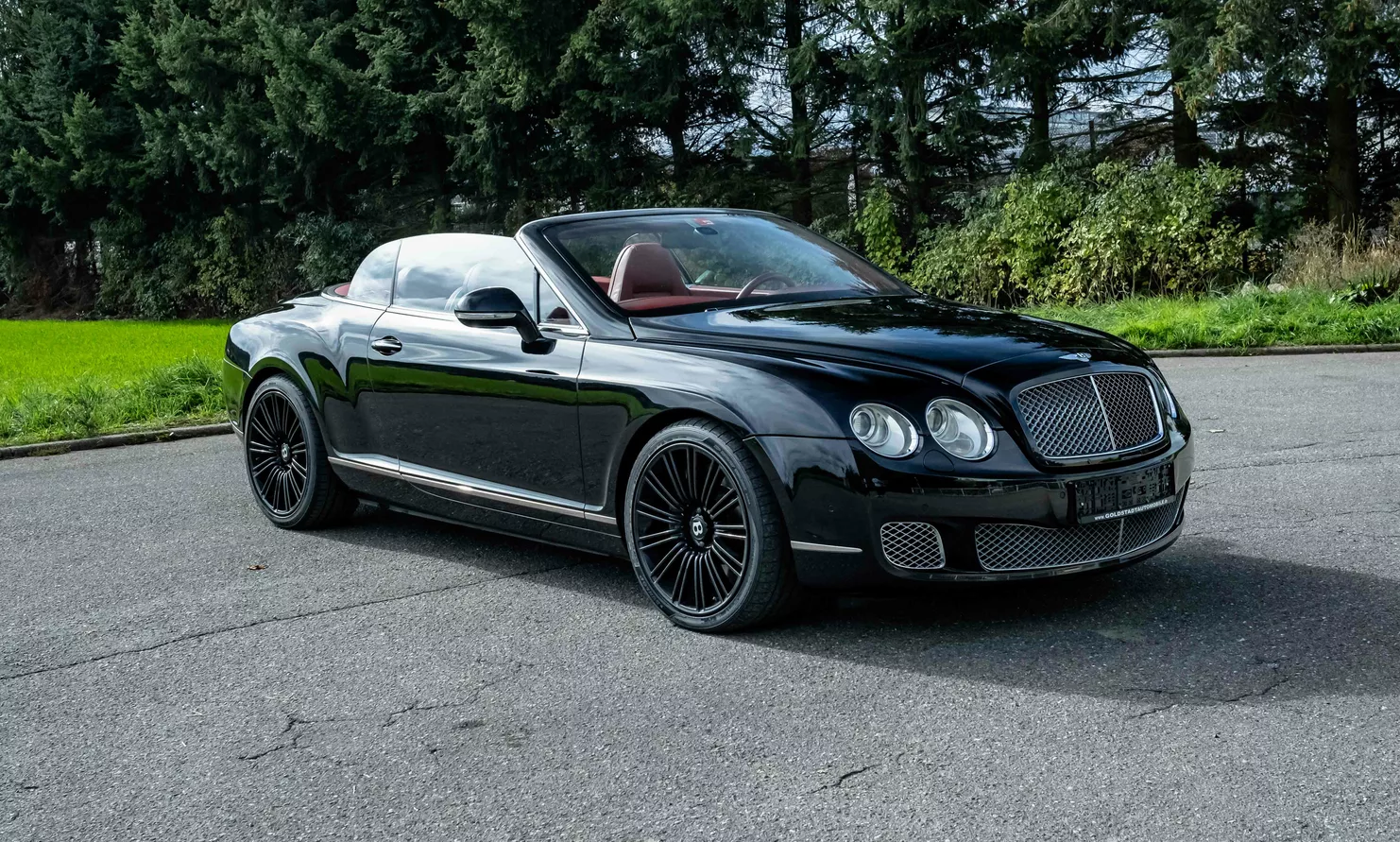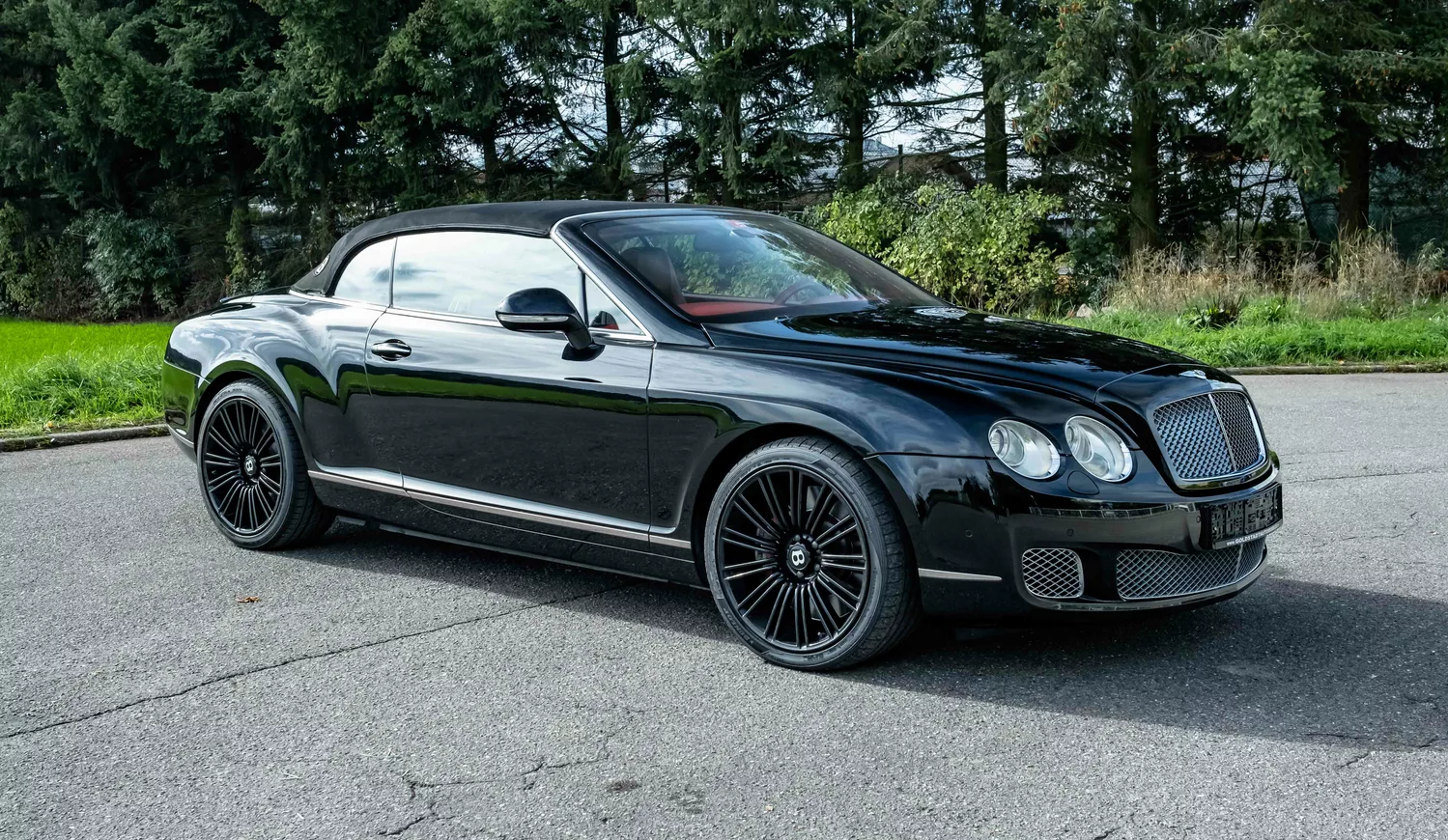 For sale is a 2010 Bentley Continental GTC Speed ​​Convertible in black with a red leather interior.