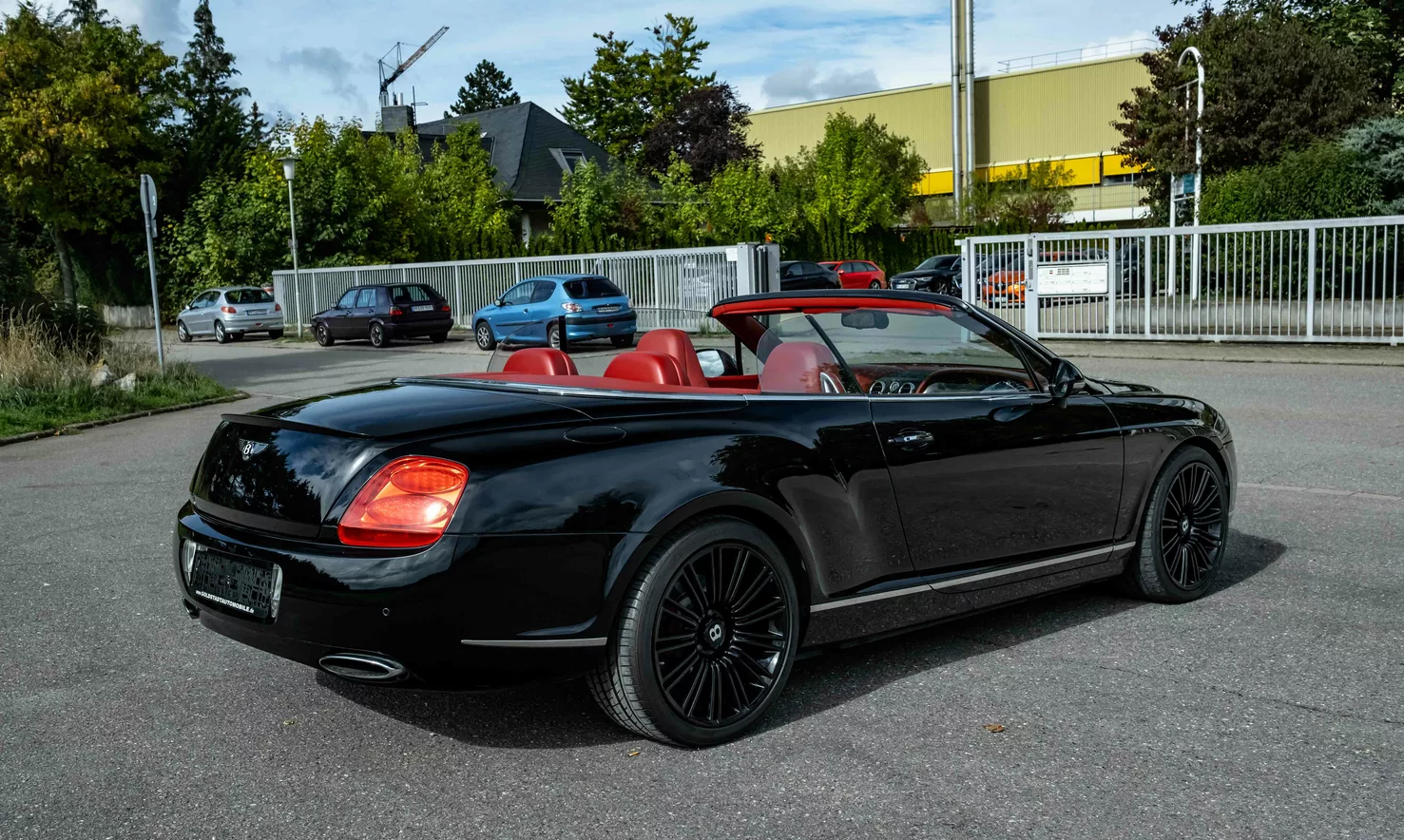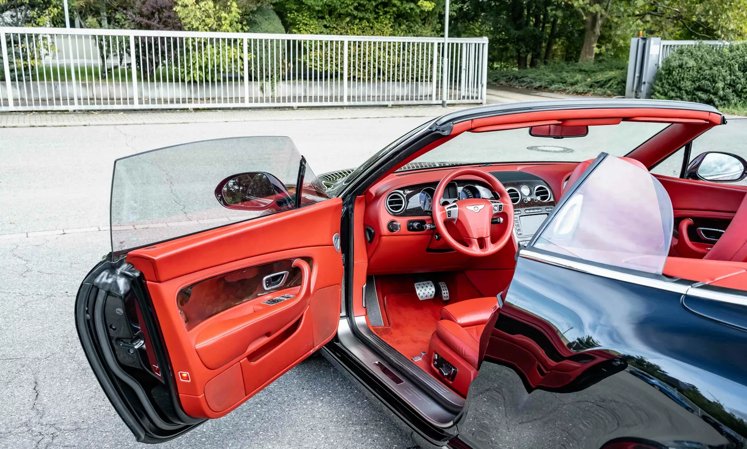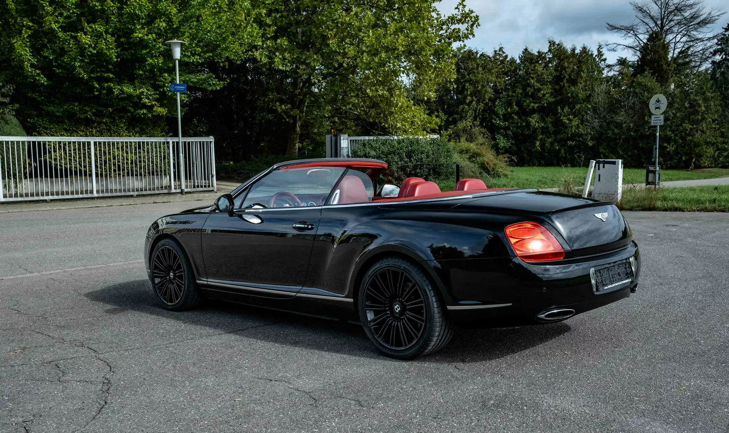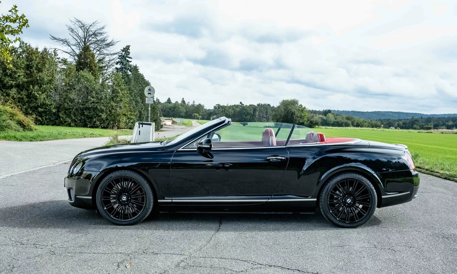 For sale is a 2010 Bentley Continental GTC Speed ​​Convertible in black with a red leather interior.
