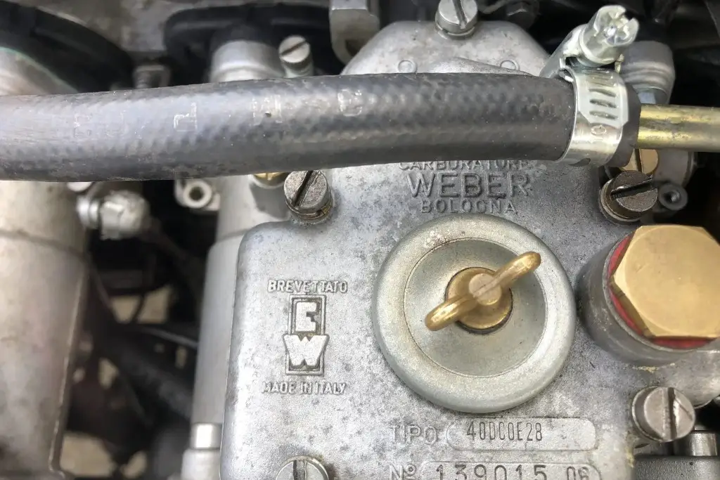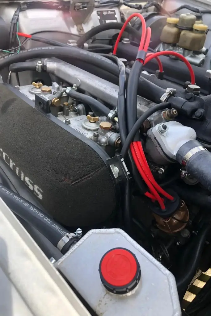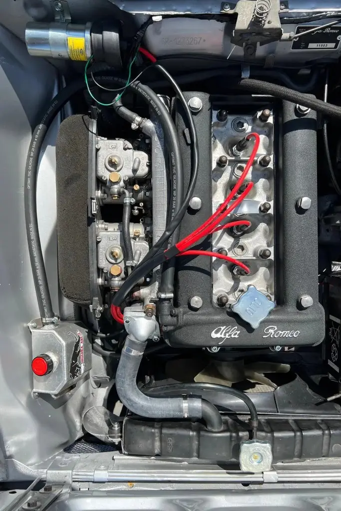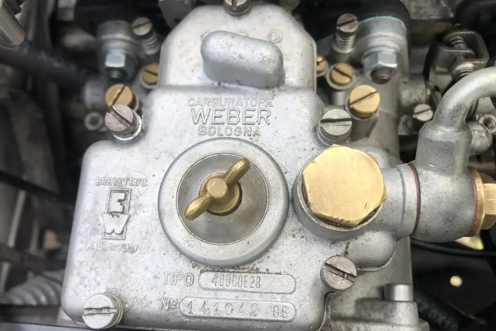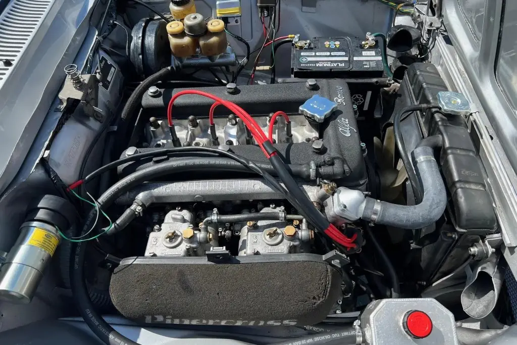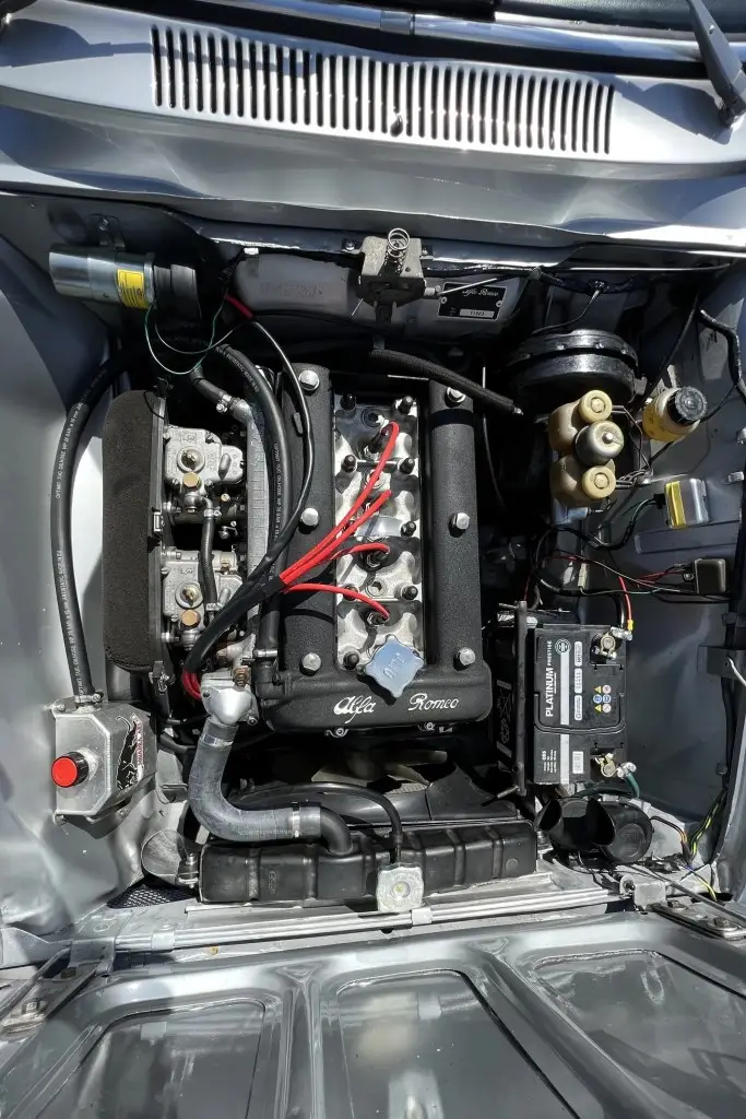 The twin-cam 1.6L inline-four was rebuilt and installed as part of the refurbishment and is equipped with dual Weber carburetors and a SACHS clutch assembly. The fuel tank was reportedly replaced during the engine swap.
