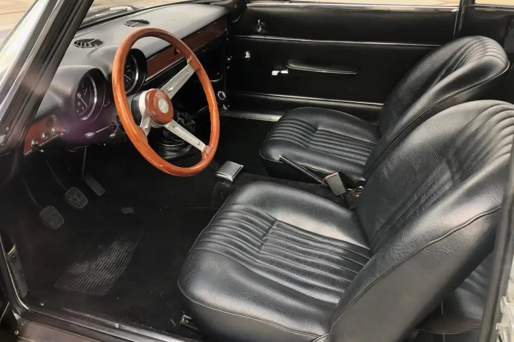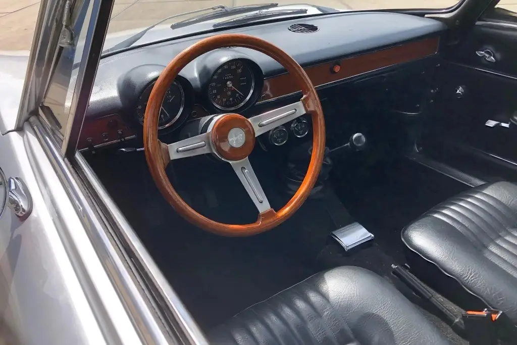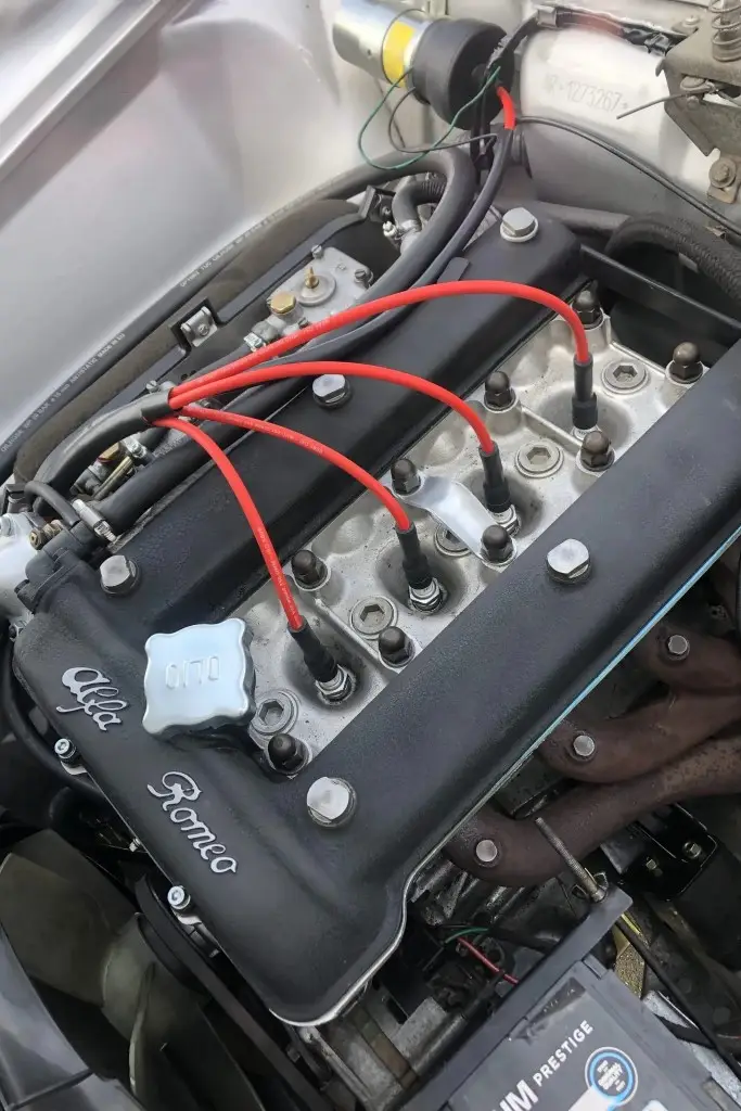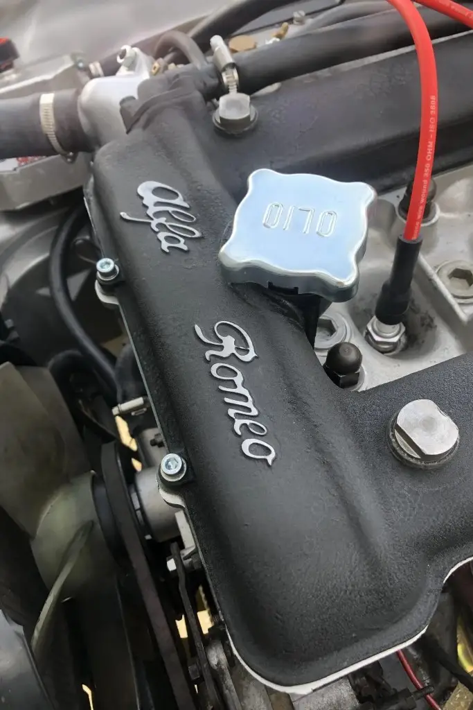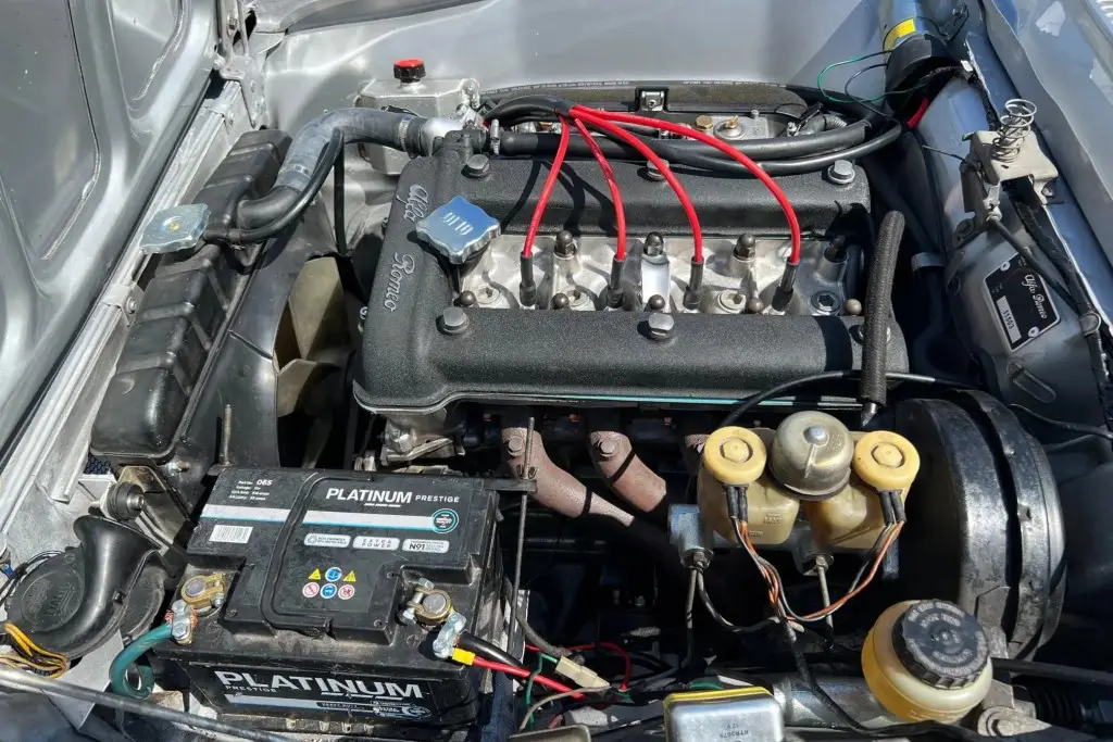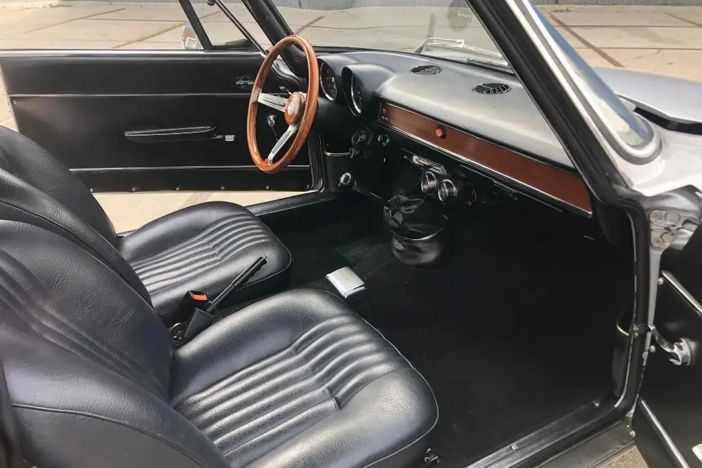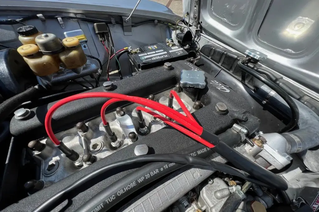 The twin-cam 1.6L inline-four was rebuilt and installed as part of the refurbishment and is equipped with dual Weber carburetors and a SACHS clutch assembly. The fuel tank was reportedly replaced during the engine swap.