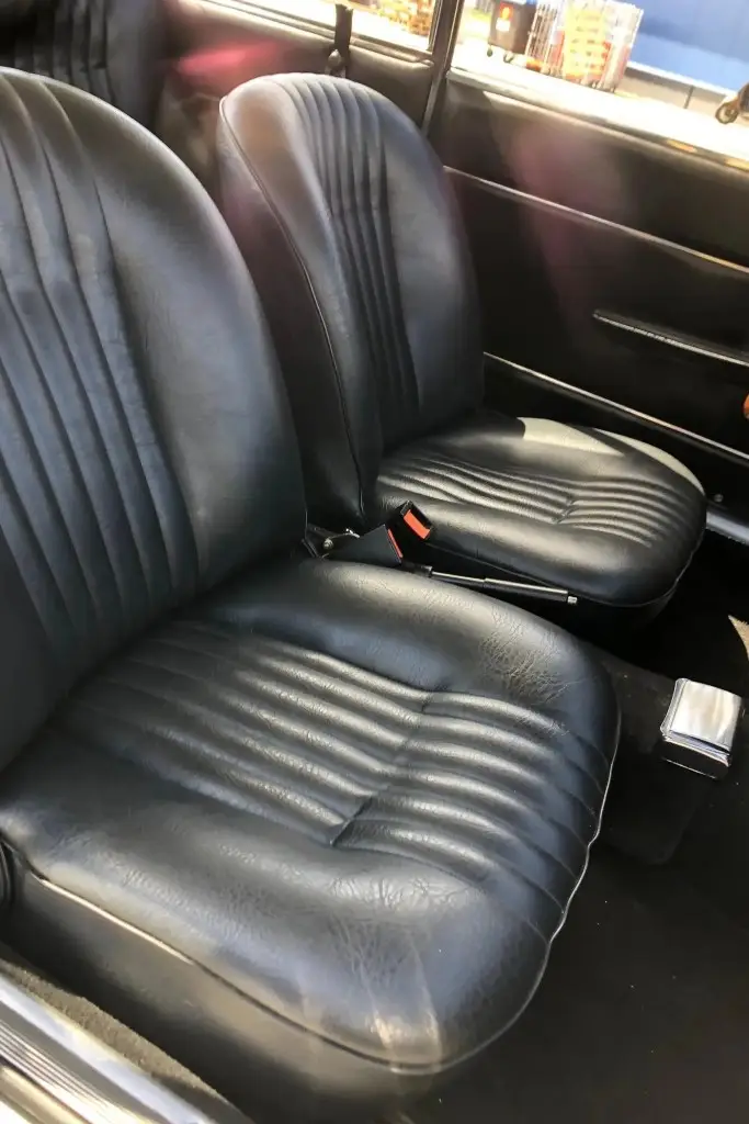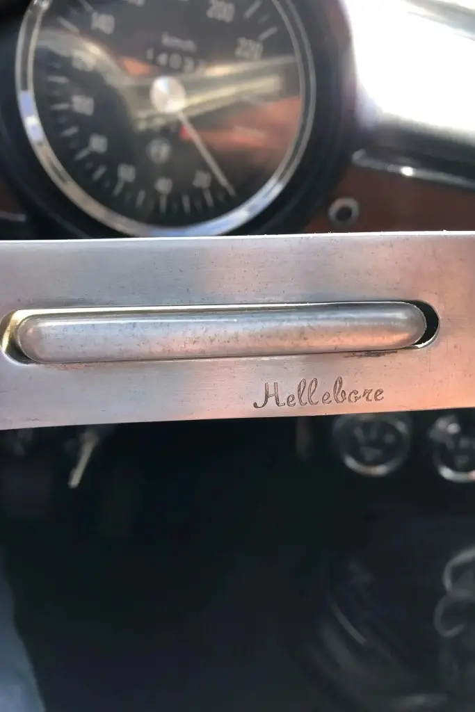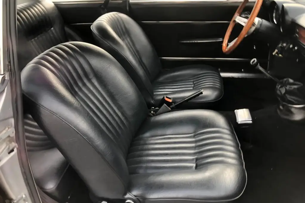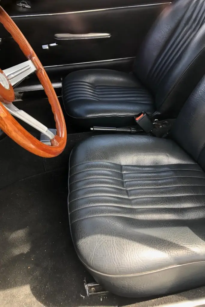 The front bucket seats, rear bench, and door panels are upholstered in black leather, and the cabin and trunk carpets are said to have been replaced during the refurbishment. Wood trim accents the dashboard, and additional appointments include a wood-rim Hellebore steering wheel, a padded dash cover, a locking glove compartment, a cabin heater, and manual crank windows.