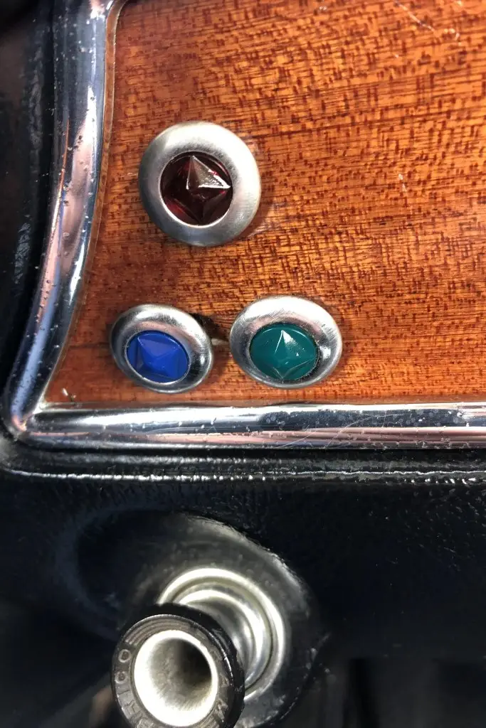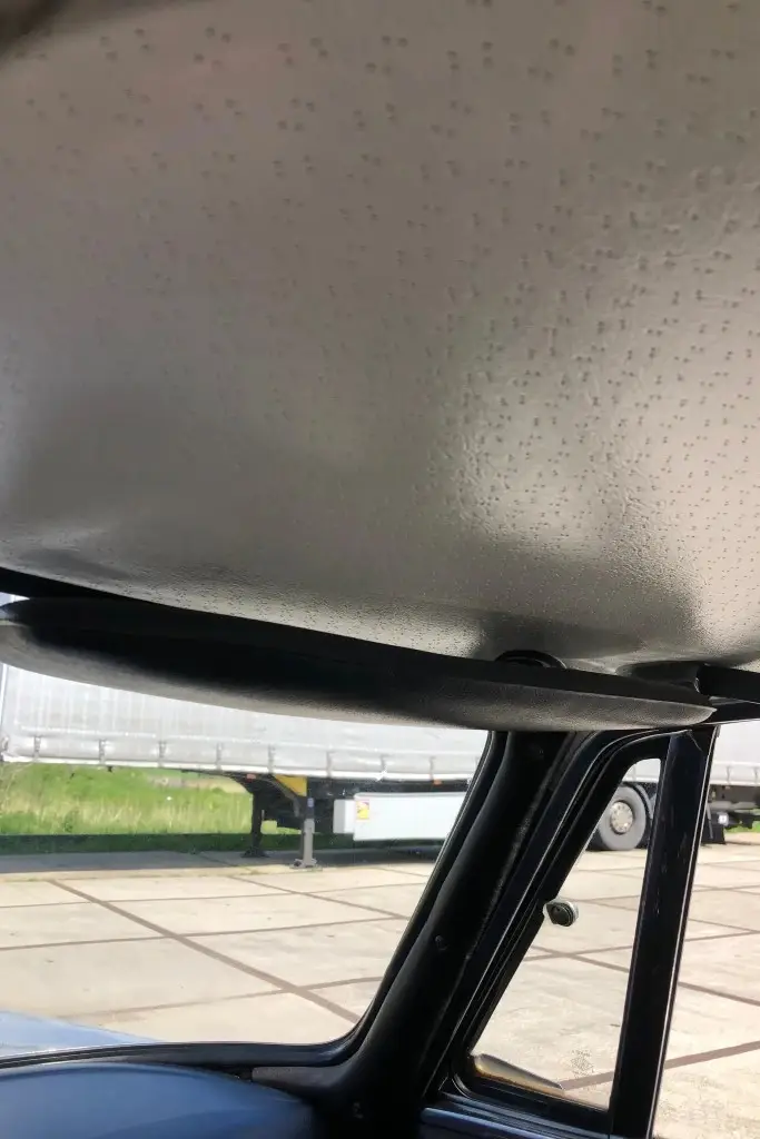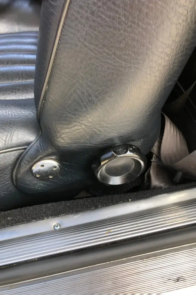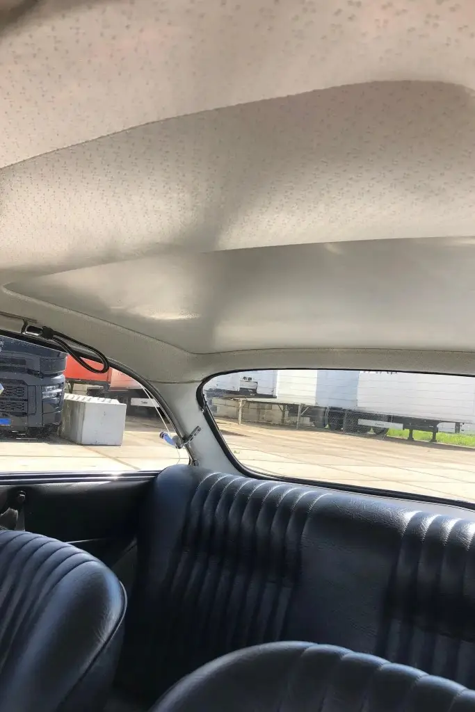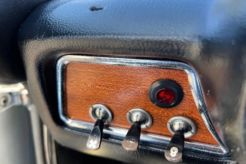 The front bucket seats, rear bench, and door panels are upholstered in black leather, and the cabin and trunk carpets are said to have been replaced during the refurbishment. Wood trim accents the dashboard, and additional appointments include a wood-rim Hellebore steering wheel, a padded dash cover, a locking glove compartment, a cabin heater, and manual crank windows.