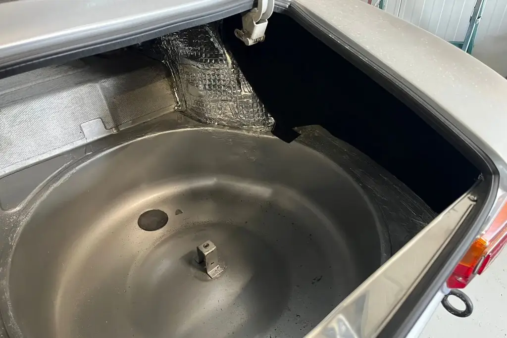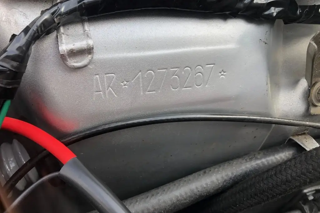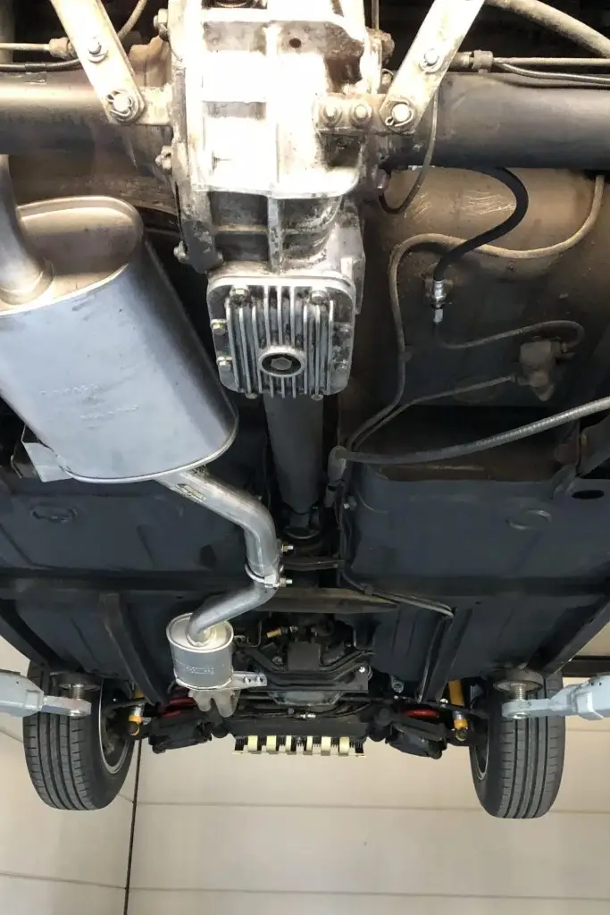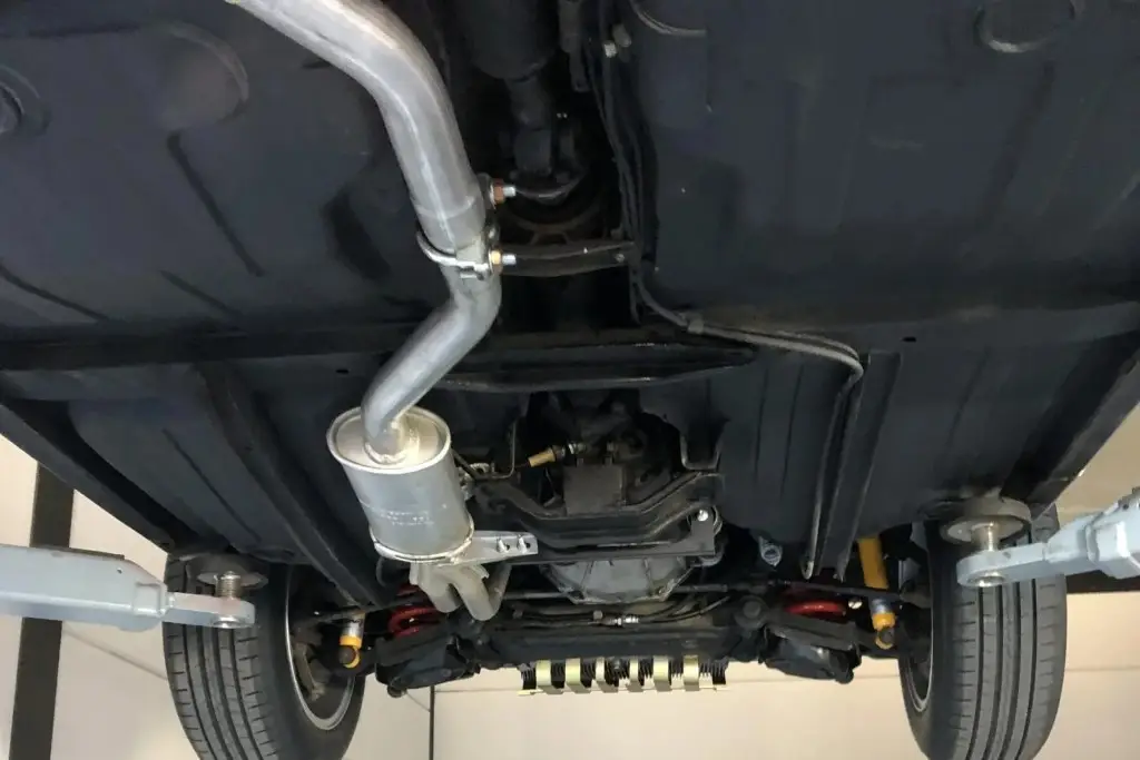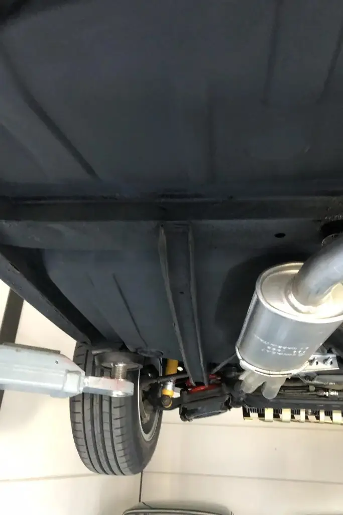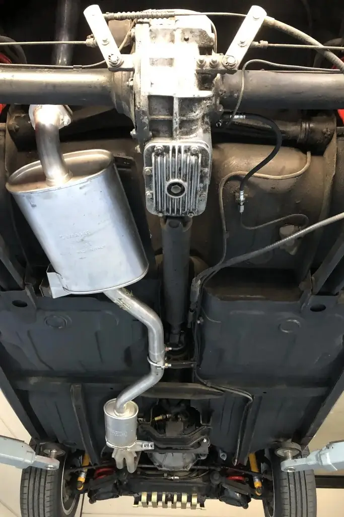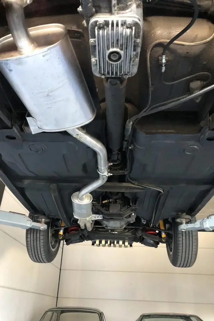 Power is sent to the rear wheels through a five-speed manual transmission. The underside has been refinished, and an Imasaf exhaust system is installed.