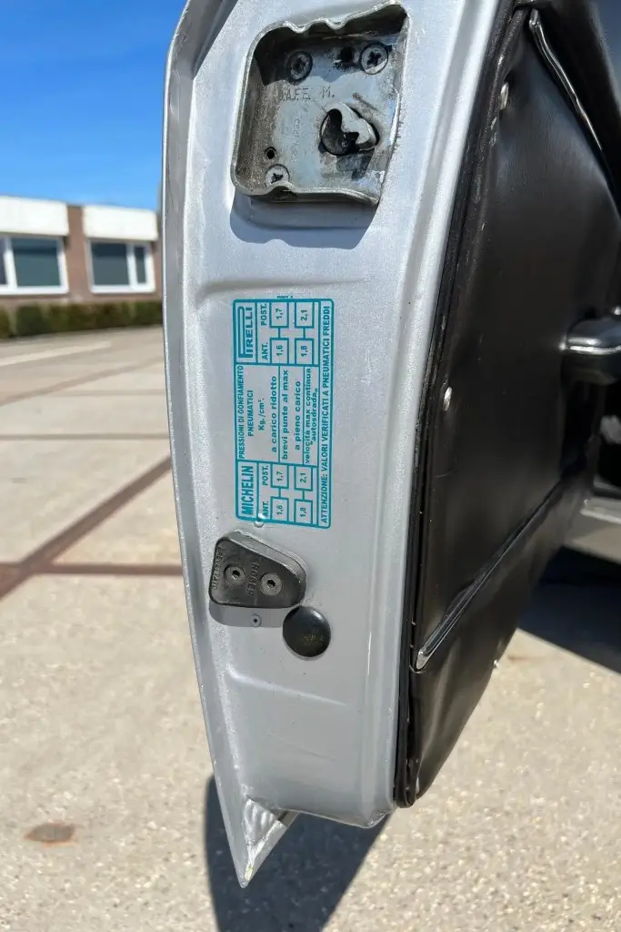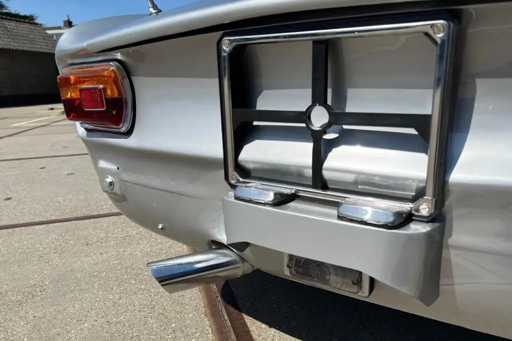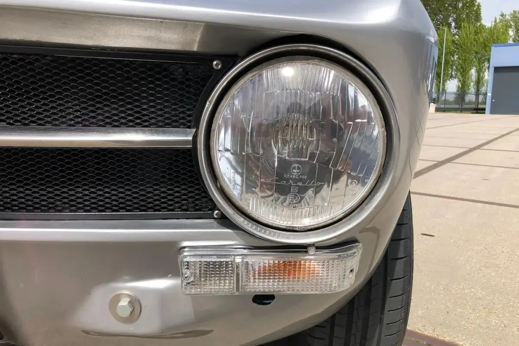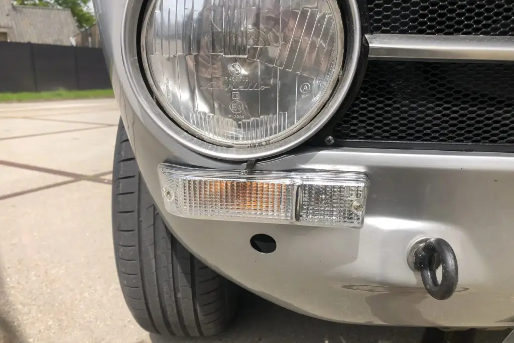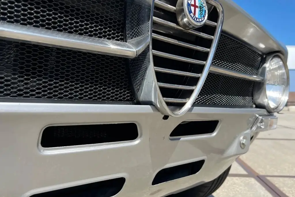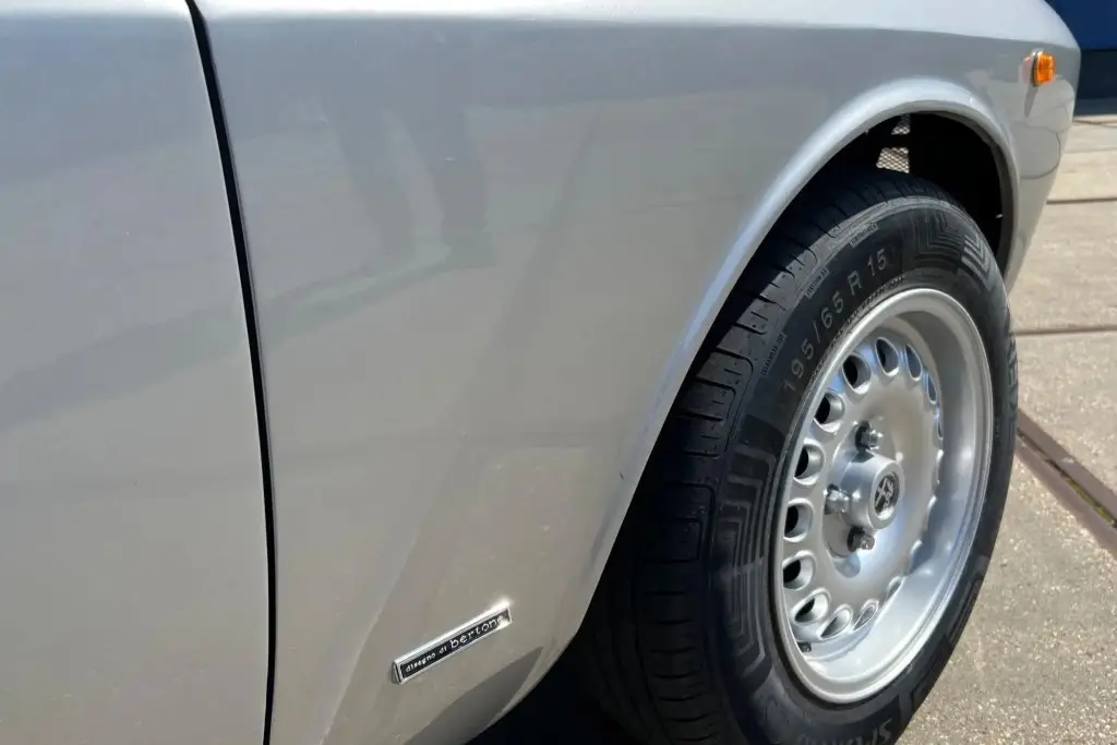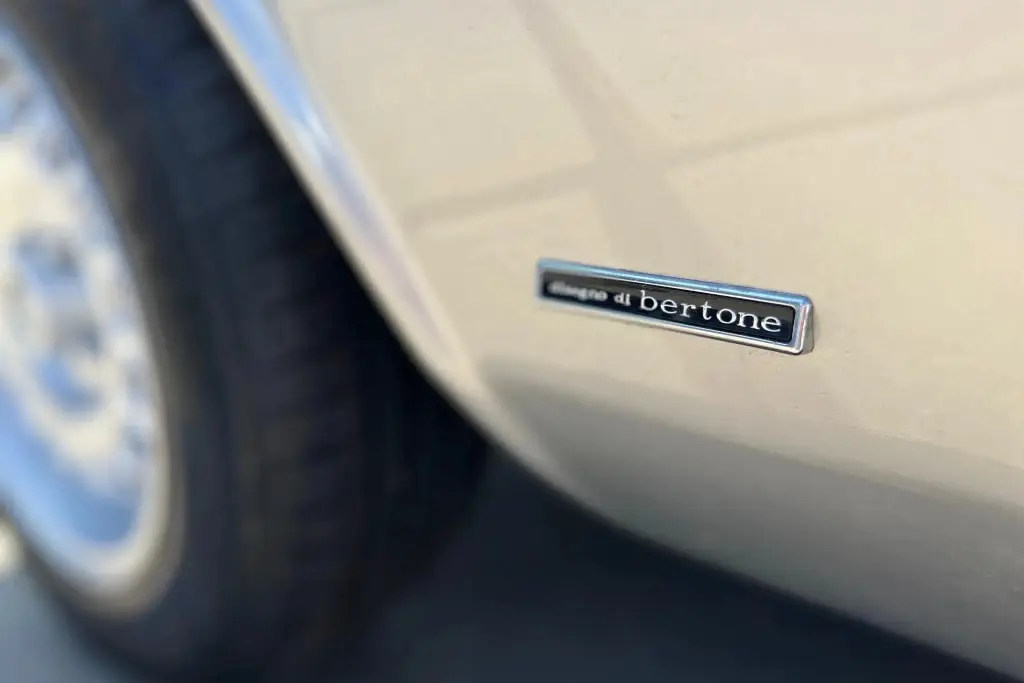 The Bertone-designed body was repainted silver as part of the refurbishment, and Carello headlight and taillight assemblies and windshield wipers were reportedly installed. The bumpers have been removed, and exterior details include pop-out rear windows, a polished exhaust outlet, quarter vent windows, a left-side mirror, and front and rear tow hooks. Holes in the body are present where the bumpers were attached. The gallery photos were taken in Summer 2023 and the car has been driven approximately 420 kilometers