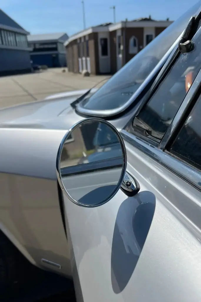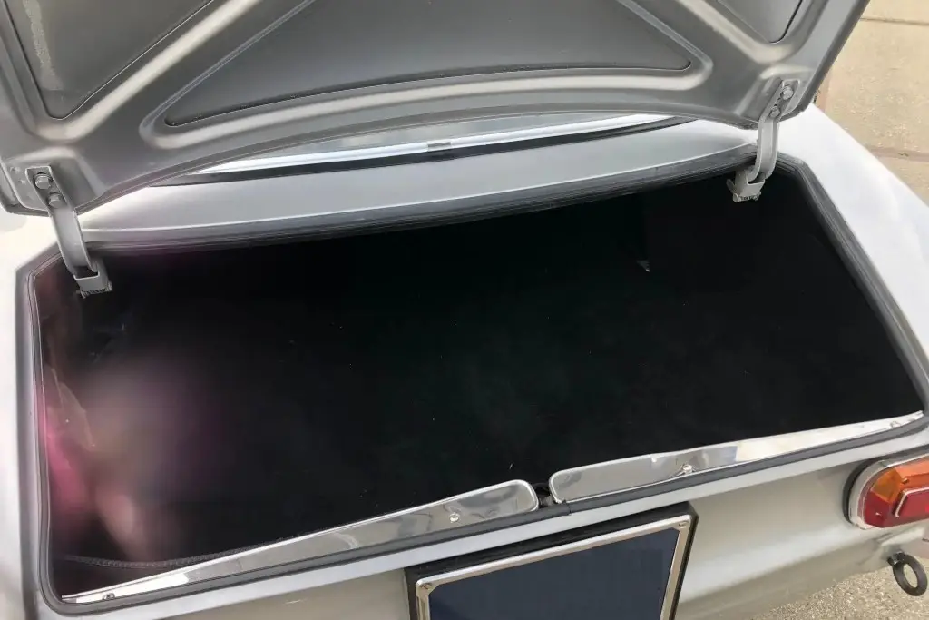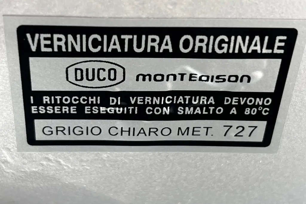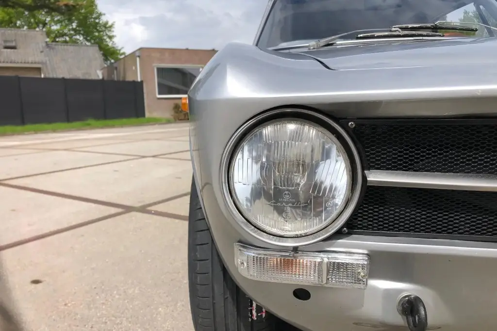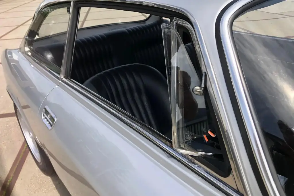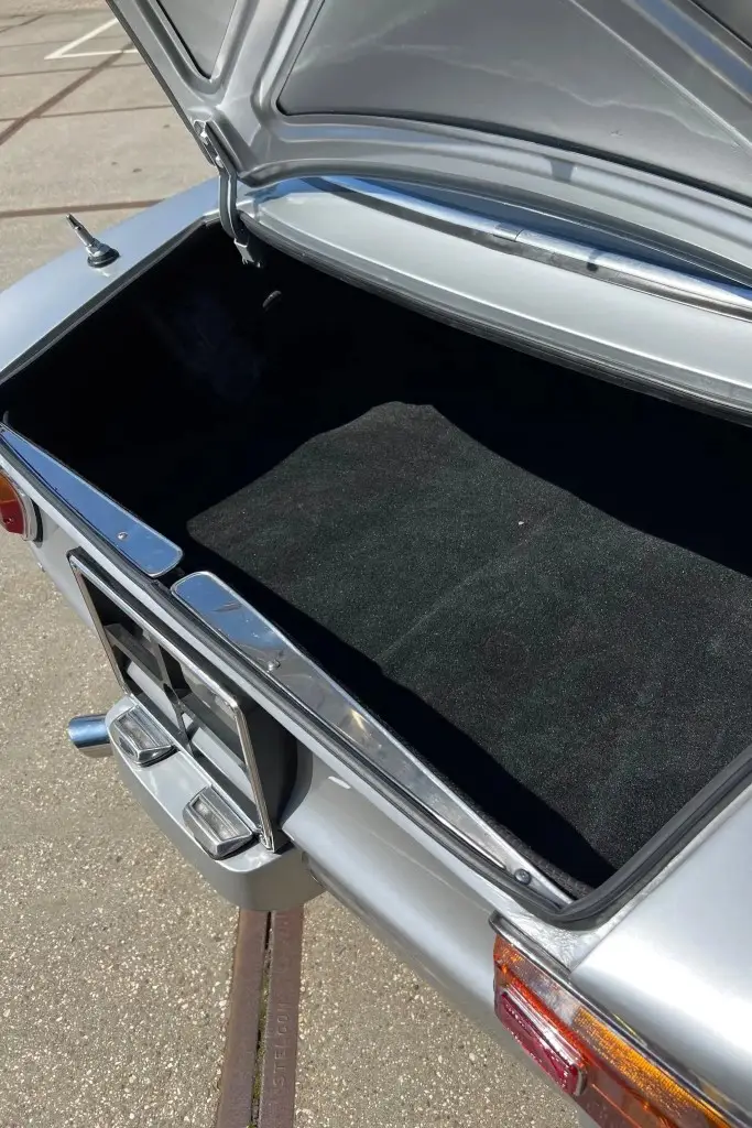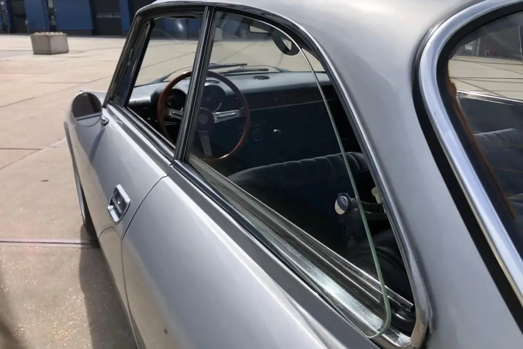 The Bertone-designed body was repainted silver as part of the refurbishment, and Carello headlight and taillight assemblies and windshield wipers were reportedly installed. The bumpers have been removed, and exterior details include pop-out rear windows, a polished exhaust outlet, quarter vent windows, a left-side mirror, and front and rear tow hooks. Holes in the body are present where the bumpers were attached. The gallery photos were taken in Summer 2023 and the car has been driven approximately 420 kilometers