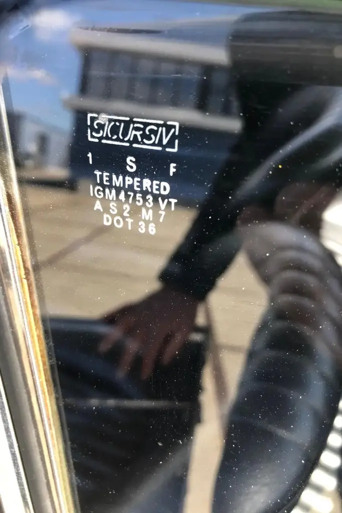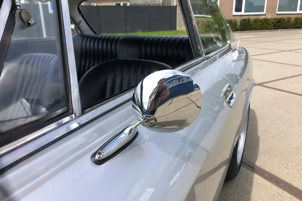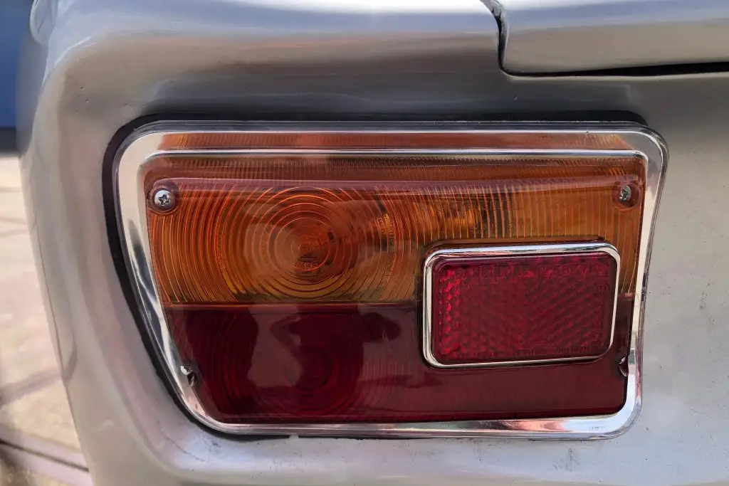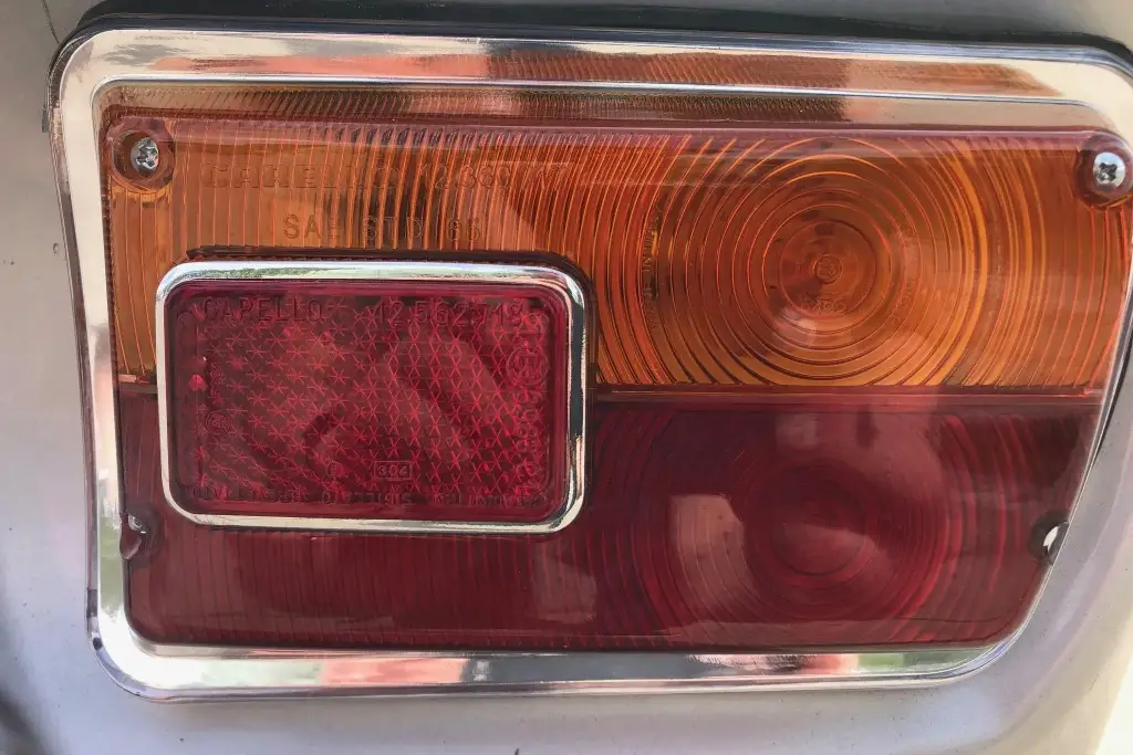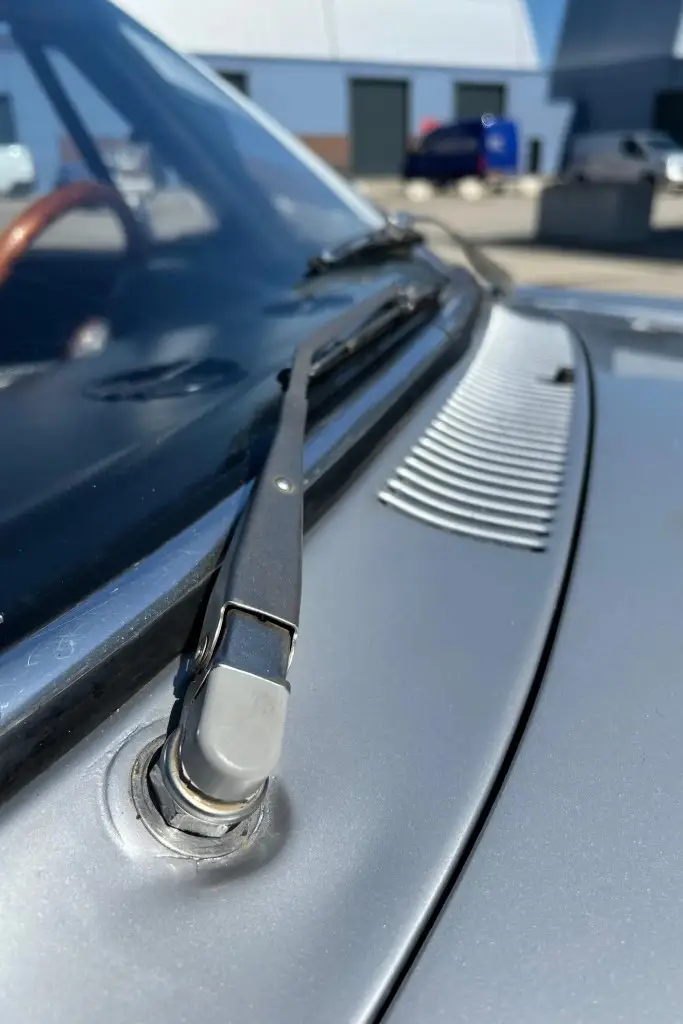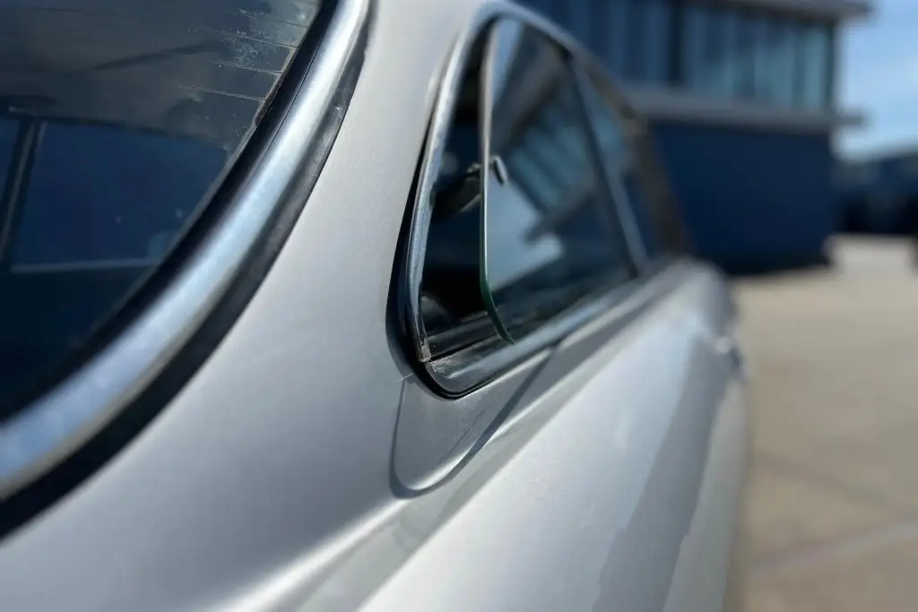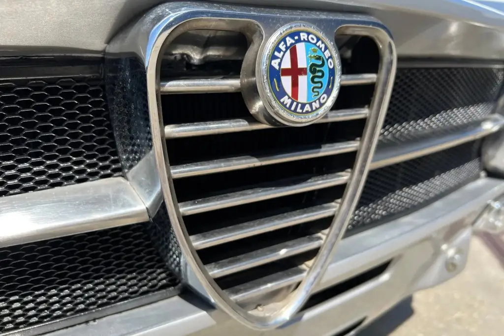The Bertone-designed body was repainted silver as part of the refurbishment, and Carello headlight and taillight assemblies and windshield wipers were reportedly installed. The bumpers have been removed, and exterior details include pop-out rear windows, a polished exhaust outlet, quarter vent windows, a left-side mirror, and front and rear tow hooks. Holes in the body are present where the bumpers were attached. The gallery photos were taken in Summer 2023 and the car has been driven approximately 420 kilometers