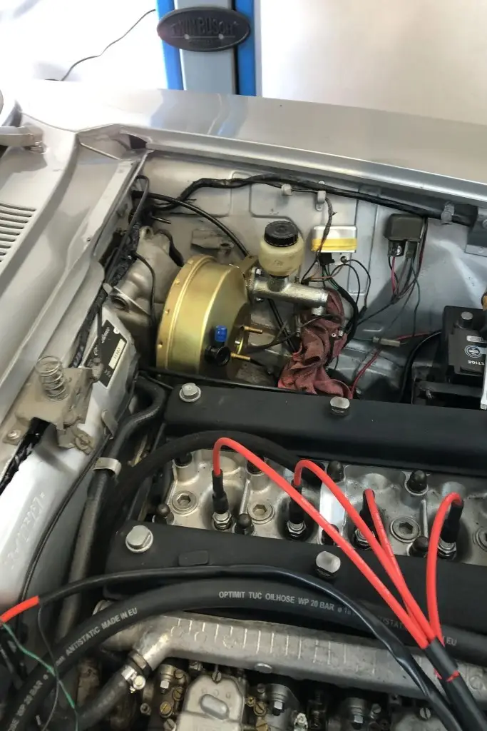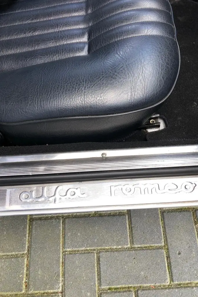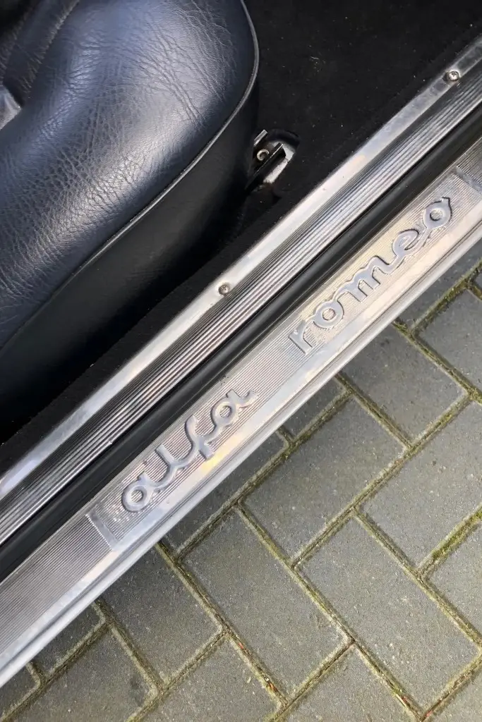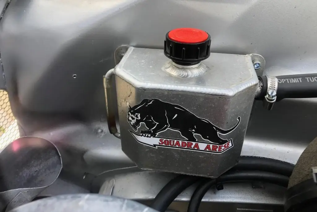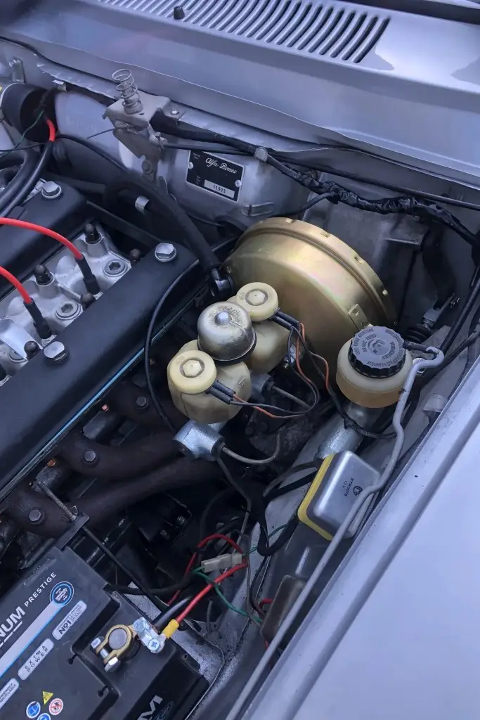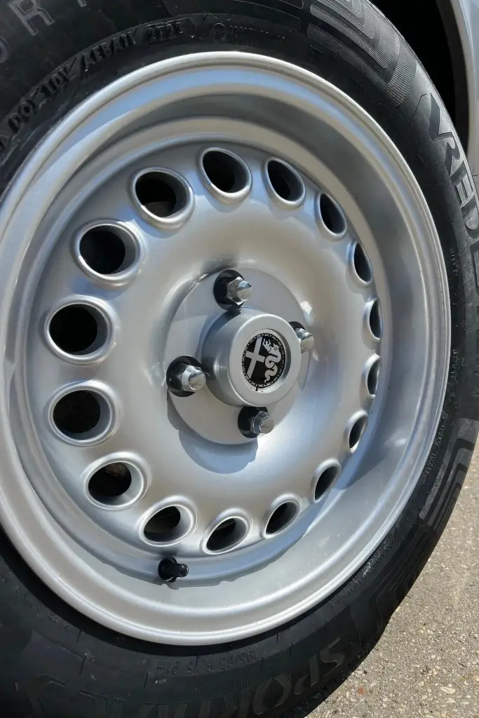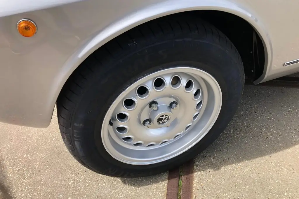 Silver 15 Inch GTA-style wheels are mounted with 195-series Vredestein Sporttrac tires. The car is equipped with ATE front disc brakes, Koni shocks, and Arese lowering springs. The wheel bearings and rear wheel cylinders were reportedly replaced during the refurbishment.